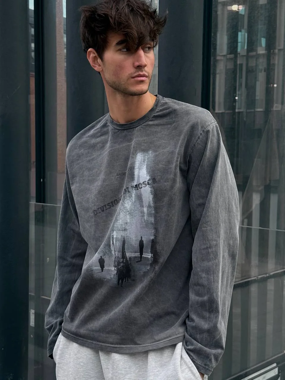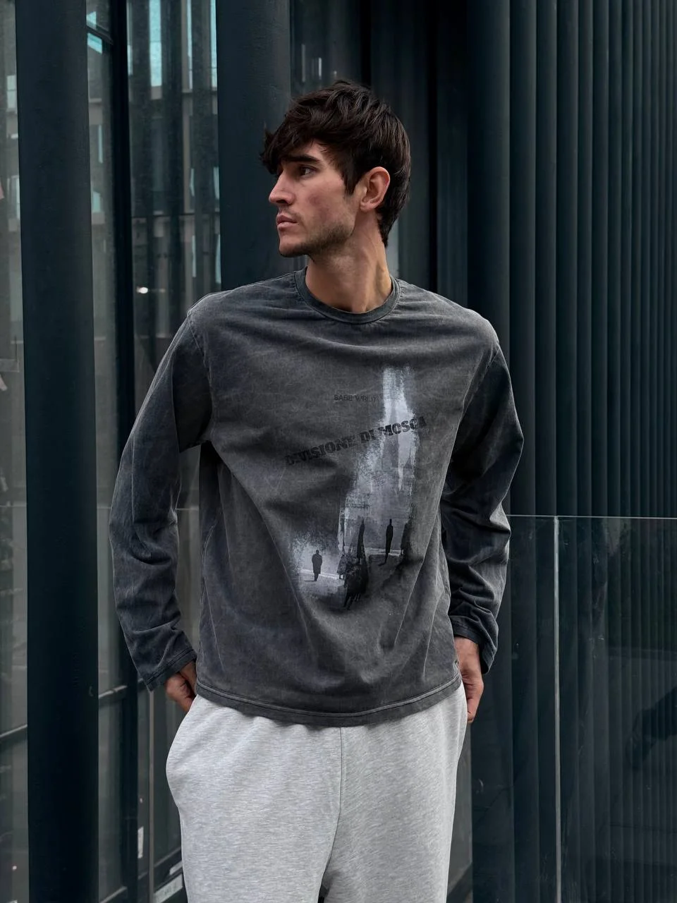 Лонгслив Sabe Longsleeve Di Mosca Acid Wash Dark Grey - лонгслив свободного кроя с длинным рукавом.Модель выполнена в технике кислотной стирки, которая придаёт ткани уникальный винтажный эффект и глубину тёмно-серого оттенка.