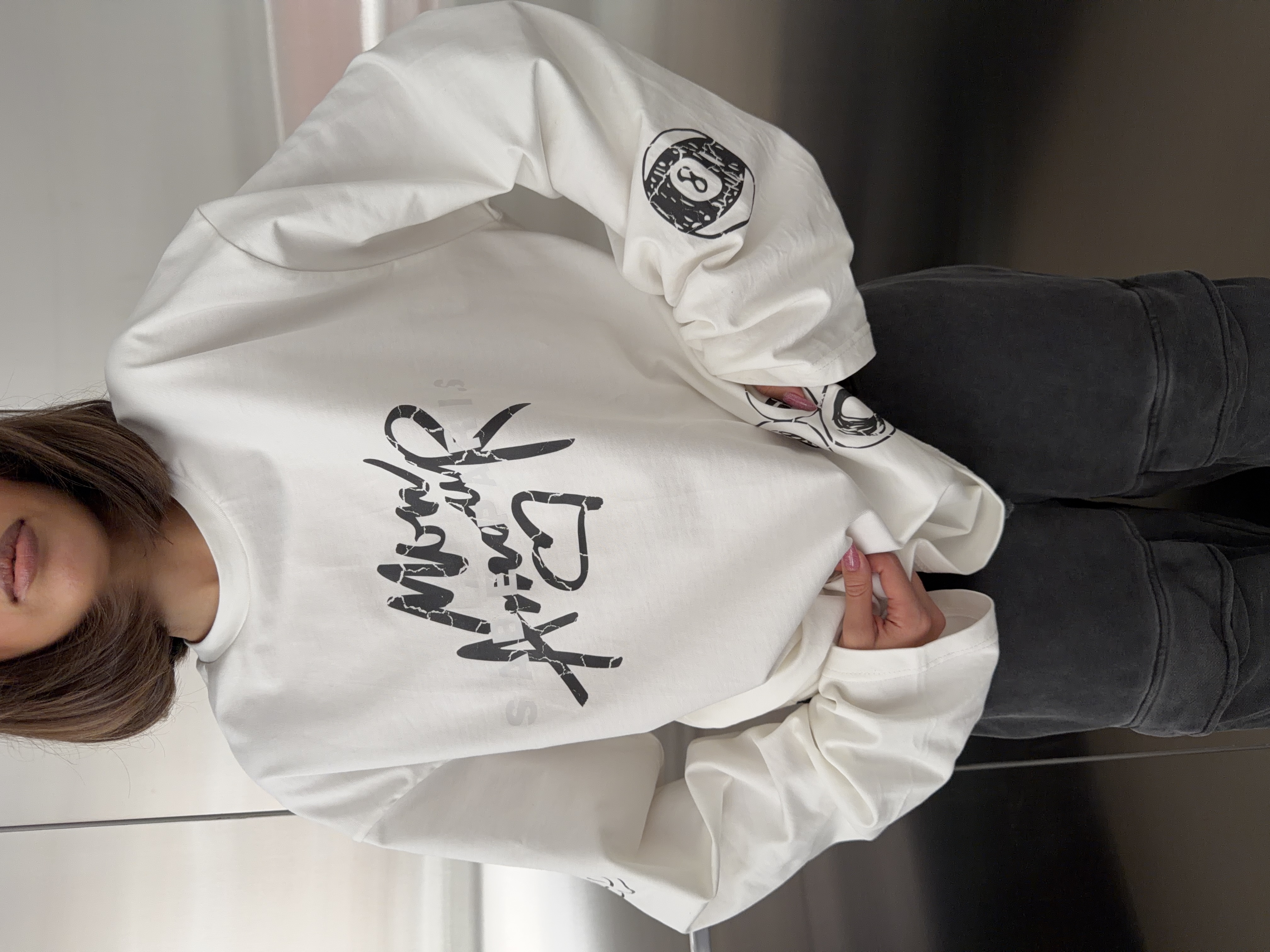 Sabe Mon Amour White Long Sleeve - лонгслив с длинными рукавами прямого кроя из плотного хлопка. Первая коллекция SABE PARIS — это сочетание личных воспоминаний о Париже, архивных фотографий и оригинальных скетчей, трансформированных в принты на этапе дизайна.